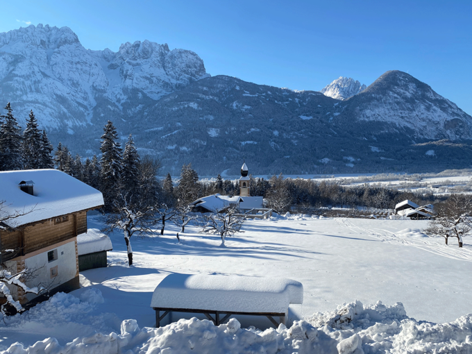 Wer seine Vorräte aufstocken will, ruft an und holt’s dann ab: Fleischpakete mit frischem Rindfleisch zu fünf oder zehn Kilo, Getreide, Mehl, Polenta, Haferflocken, Buchweizen, Grieß, Bohnen, Karotten, Fenchel, Zwiebeln. An den lokalen Supermarkt gingen ausnahmsweise nur die Radieschen in der ver gangenen Saison. "Wir wussten zwar, dass die schnell wachsen, aber nach 18 Tagen haben uns die Radieserl fast überrannt“, lacht Mama Germana. "Nicht viele Bauern haben ihre Äcker und Weiden rings um das Haus“, sagt Pondorfer und schaut sich um, auf den Wald, vor dem zwei Häuschen für Gäste stehen, die dick eingeschneiten Wiesen, die kahlen, knorrigen Obstbäume. Und der Blick reicht weit über Lienz. Wobei er lieber auf die Dolomiten schaut, verrät er beim Blick aus der Werkstatt. Alles, was aus Holz ist, wird dort selbst gebaut, hergestellt, repariert. Jetzt im Winter kann er ein bisschen durchschnaufen, die Maschinen warten, Geräte reparieren. Die Stallarbeit bleibe sowieso. Im Frühjahr geht’s dann wieder los, als erstes mit den Obstbäumen. Die Kühe, acht bis zehn Stück, sind im Sommer auf der Alm, oben am Stronacher Kogel. Und die Gäste, die auf dem Weg dorthin die Hütte auf 1.350 Meter gemietet haben, bekommen Milch und Erdäpfel. "Die backen Brot und sind komplette Selbstversorger“, sagt Pondorfer. Gekocht wird dort auf dem Holzherd, Strom gibt’s keinen. Dennoch bleiben Gäste oft anderthalb, zwei Monate und "kemmen da nimma oba“. Die Kühe bleiben den ganzen Sommer. Bis auf die, die der Metzger in Görtschach schlachtet - ungefähr alle zwei Monate. Natürlich wird fast alles verwertet. Was nicht an Privathaushalte geht, nehmen Gastronomen, Reste bekommen die Hunde oder das Gymnasium fürs Obduzieren.