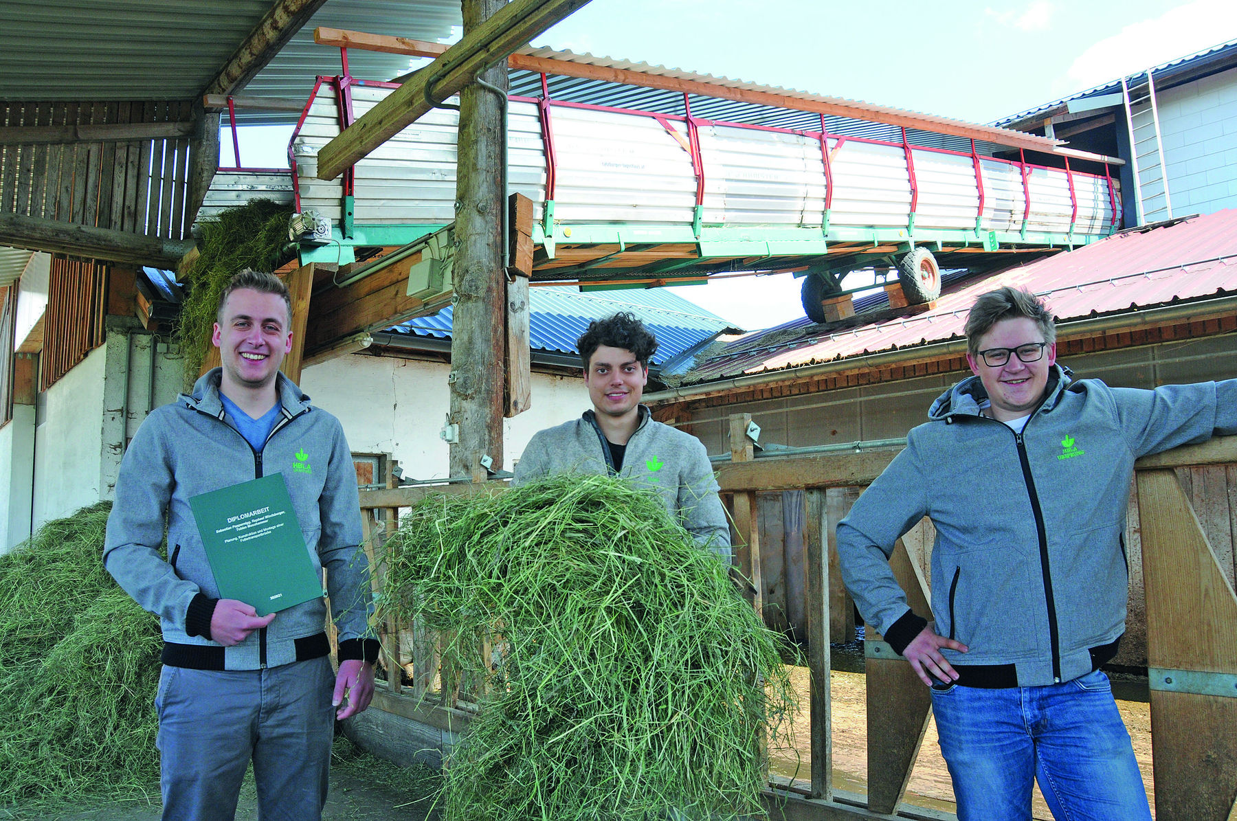Hinter der spektakulären Installation verbirgt sich eine Lösung, die die Heufütterung erleichtert. Gebaut wurde sie von drei Ursprunger Schülern als Maturaprojekt am Hof des Landtechnik-Professors. Georg Ibertsberger hat Sebastian Pappernig, Tobias Mosshammer und Raphael Windsberger angeboten, dass sie ihre Abschlussarbeit bei ihm am Betrieb verwirklichen können. Denn seit dem Bau des Rundholzstalles vor rund 20 Jahren gab es keine direkte Verbindung zwischen Heulager und Futtertisch. Das Heu musste wöchentlich auf einen Ladewagen verladen und in den Stall gebracht werden. Die Aufgabenstellung für die drei Maturanten lautete daher, ein möglichst kostengünstiges Futtertransportband zu konstruieren.