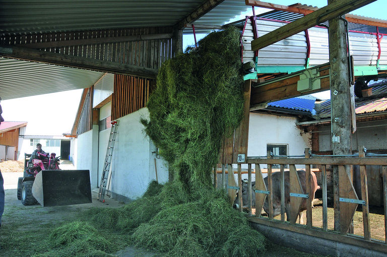 Die Futtertransportbrücke wirft das Heu direkt am Futtertisch ab, mit dem Hoflader wird es zu den Tieren geschoben. © LK Salzburg/Dürnberger