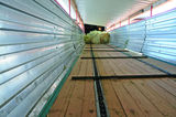 Anfängliche Überlegungen für ein klassisches Förderband aus PVC wurden aus Kostengründen und auch wegen möglicher Umweltgifte schnell verworfen. Die Idee mit den ausrangierten Ladewägen brachte die Lösung. Vier baugleiche Steyr-Hamster-Ladewägen der Typen 802/803 konnten relativ einfach aufgetrieben werden. Die Kosten waren mit ca. 400 Euro je Ladewagen ebenfalls überschaubar. In ca. 220 Arbeitsstunden wurden die Fahrzeuge bis auf den Rahmen "abgewrackt" und jeweils zwei und zwei Ladewägen zusammengeschweißt - in Summe zu einer Länge von knapp 20 Metern. Für den Aufbau wurden zudem möglichst viele Teile wiederverwertet. Die Auflager für das Dach wurden aus dem Dürrfutteraufbau gemacht, die Kratzbodenketten und Schienen lediglich verlängert.