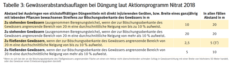 Bei der Ausbringung von stickstoffhältigen Düngemitteln (Mineraldünger, Wirtschaftsdünger etc.) sind die Mindestabstände zu Oberflächengewässern zu beachten (siehe Tabelle 3).