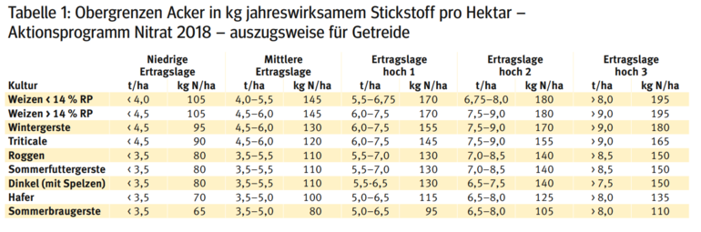 Im derzeit gültigen Aktionsprogramm 2018 sind für Acker (siehe Tabelle 1 – Auszug Getreide) in Abhängigkeit von der Ertragslage bzw. Nutzungsintensität Stickstoffobergrenzen festgelegt.