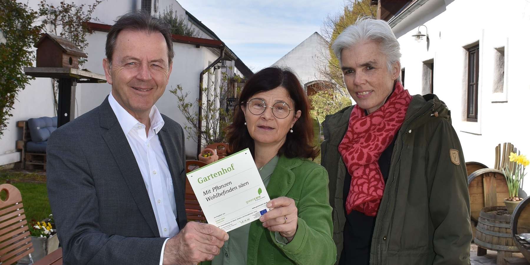 Die Geschäftsführerin des Vereins Green Care Österreich Mag. a (FH) Nicole Prop, Winzerin und Betreiberin des ersten Gartenhofs im Burgenland Birgit Braunstein zusammen mit dem Präsidenten der Landwirtschaftskammer Burgenland DI Nikolaus Berlakovich bei der Überreichung der Plakette zum "Gartenhof" in Purbach. © Tesch-Wessely/LK Burgenland