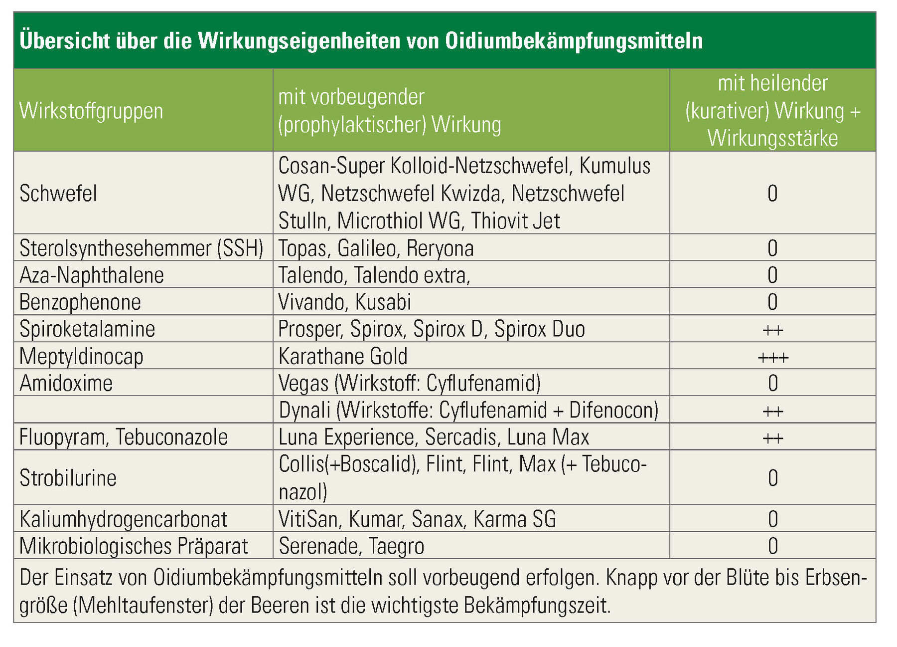 Die Oidiumbekämpfung ist mit größter Aufmerksamkeit durchzuführen. Sowohl kulturtechnische als auch chemische Behandlungsmaßnahmen müssen immer vor dem Sichtbarwerden des Oidiumpilzes erfolgen. Die chemischen Behandlungsmaßnahmen sollen nicht vor Mitte August beendet werden.