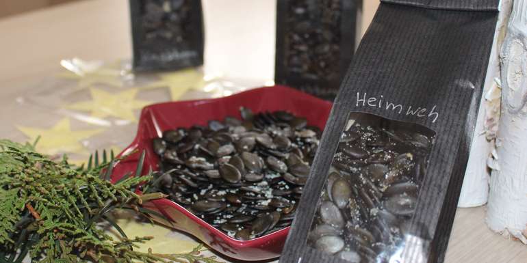 Diese regionale Knabberei ist eine Eigenkreation. Burgenländische Weinproduzenten könnten diese Kerne mit ihrem „besonderen“ Wein herstellen. Das Foto zeigt Kerne, die mit einem „Heimweh – Wein“ hergestellt wurden. Der „Heimwehwein“ ist markengeschützt und ein Cuvee aus Blaufränkisch und Merlot.