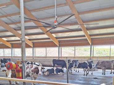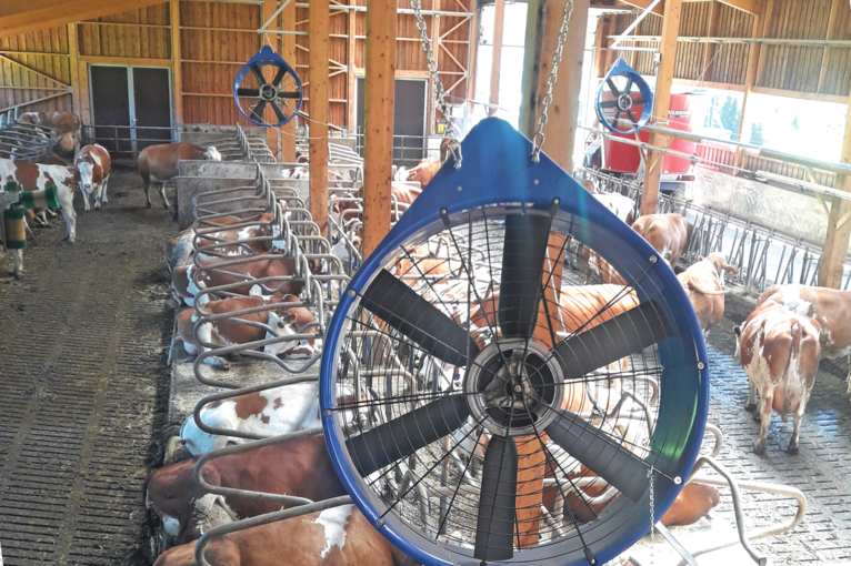 Diese Ventilatoren erreichen die geforderte Windgeschwindigkeit nur direkt unter ihnen und sind somit für eine effektive Kühlung eher ungeeignet. Es kann sogar dazu kommen, dass die warme Luft direkt unterm Dach angesaugt und auf die Kühe geblasen wird.