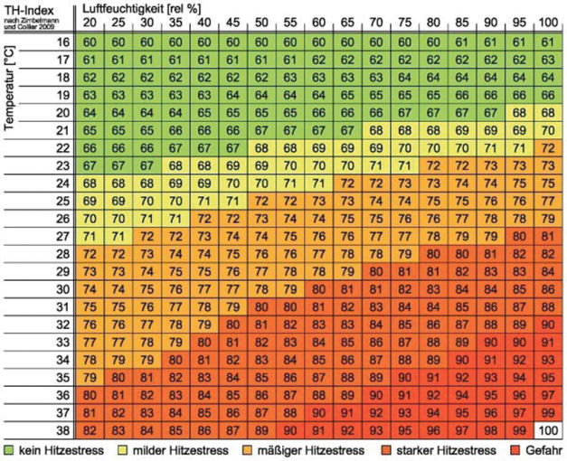 Wie stark die Hitzestressbelastung auf die Kuh wirkt, ist neben der Temperatur auch stark von der Luftfeuchtigkeit abhängig. Je höher die Luftfeuchtigkeit, desto früher kommt es zum Hitzestress. Der TH-Index (Temperatur-Luftfeuchtigkeit-Index) gibt Auskunft, ab welchem Grenzwert es bei den Tieren zu Beeinträchtigungen kommt. Als Grenze gilt ein THI-Wert von 68. Dieser kommt bei 20 °C und 95% relativer Luftfeuchtigkeit (rf), aber auch bei 21 °C und 70% rF sowie bei 22 °C und 50% rF zustande.