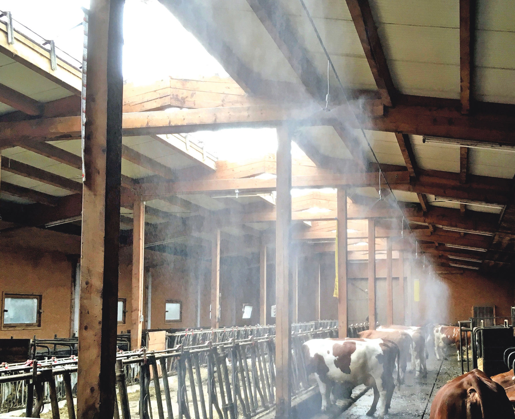 Damit ein Niederdruck- oder ein Hochdrucksystem verbaut werden kann, müssen dieselben Voraussetzungen erfüllt werden, auch wenn sie vollkommen unterschiedlich arbeiten. Der feine Sprühnebel kühlt die erhitzte Luft ab. Bevor über eine Investition in eine Kuhdusche oder eine Vernebelungsanlage nachgedacht wird, muss der Luftwechsel im Stall optimal funktionieren, damit es zu keiner Erhöhung der Luftfeuchtigkeit kommt, da dadurch der THI-Wert steigt und eine Verschlechterung der Situation eintritt (Saunaeffekt). Aufgrund der Erfahrungen der letzten Jahre sieht man, dass in unseren Breitengraden die Kühlung der Kühe noch ohne Einsatz von Wasser durchgeführt werden kann. Da die Gefahr der Verschlechterung der Hitzestresssituation doch sehr groß ist, werden solche Anlagen nur in Ausnahmefällen empfohlen und müssen von einem Experten berechnet und installiert werden. Das Anbringen einer einfachen Beregnung im Auslauf kann jedoch ohne viel Risiko erfolgen. Hier gibt es kein Problem mit einer zu hohen Luftfeuchtigkeit und die Tiere können sich aussuchen, ob sie nass werden wollen oder nicht.