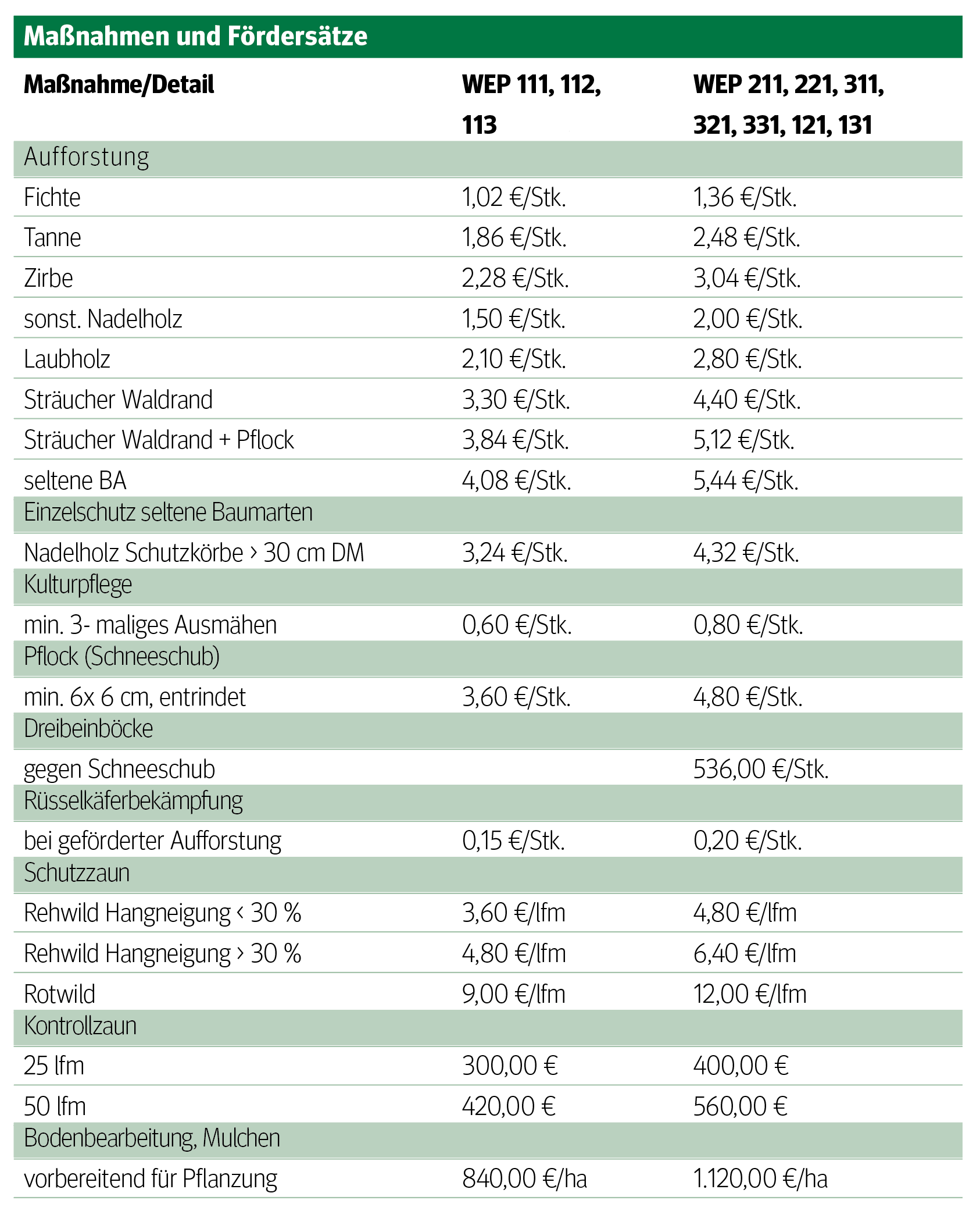 Zusätzlich förderbar sind notwendige Kulturpflegemaßnahmen. Des Weiteren sind auf Flächen mit starkem Wildeinfluss reh- und rotwilddichte Zäune von max. 0,5 ha Fläche förderwürdig. Zwischen zwei Zäunen muss jedoch ein Mindestabstand von 100 m eingehalten werden. Im Falle von Aufforstungen bzw. Naturverjüngungen mit mehr als 60% Tannen- oder Eichenanteil ist eine maximale Zaunfläche von 1 ha zulässig. Zusätzlich besteht die Möglichkeit der Förderung der Errichtung von Kontrollzäunen, die der Beurteilung des Wildeinflusses auf Waldflächen dienen. Förderbar sind ebenso Einzelschutzmaßnahmen für seltene Baumarten durch Schutzkörbe von mindestens 30 cm Durchmesser bei Nadelhölzern und Schutzkörbe oder Gitterschläuche bei Laubhölzern. Die Verwendung von Monoschutzsäulen ist von der Förderung ausgeschlossen.