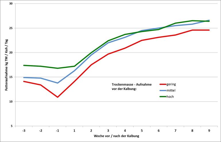 Für laktierende Kühe stellt eine ausreichend hohe Futteraufnahme die wichtigste Grundlage für eine bedarfsgerechte Versorgung in der Hochlaktation dar. Die Basis dafür wird bereits vor der Kalbung gelegt. Aus Versuchen wird ersichtlich, dass es auch bei trockenstehenden Kühen große tierindividuelle Unterschiede in der Fressleistung gibt. Besonders jene Kühe, die in der Trockenstehzeit zu wenig Futter aufnehmen, zählen nach der Abkalbung zu den Problemkühen.