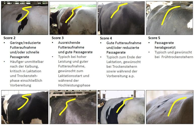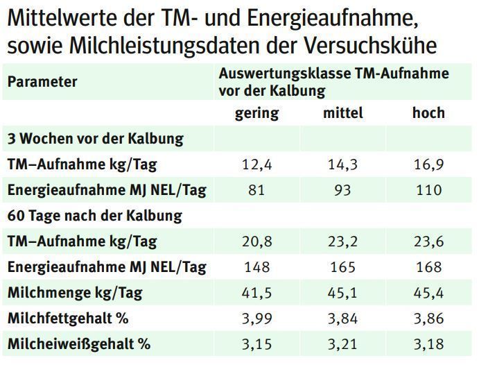 Die TM-Aufnahme von Milchkühen mit hohem Leistungspotenzial hat großen Einfluss auf die Versorgungslage, die Stoffwechselstabilität und Gesundheit der Tiere. Die Beobachtung der Futteraufnahme in der Vorbereitungsfütterung über die Dokumentation der Futtervorlage und des verbleibenden Futterrestes sowie insbesondere die intensive einzeltierbezogene Bewertung der Pansenfüllung sind im geburtsnahen Zeitraum unbedingt zu empfehlen.
